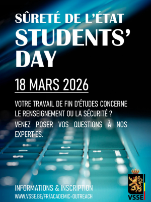 La VSSE ne peut malheureusement pas répondre favorablement aux demandes de stages et de jobs d’étudiant. En effet, pour travailler à la VSSE, même durant une courte durée, vous devriez disposer d’une habilitation de sécurité au niveau ‘Très Secret'. L’attribution de ces habilitations nécessite environ six mois d’enquête préalable.